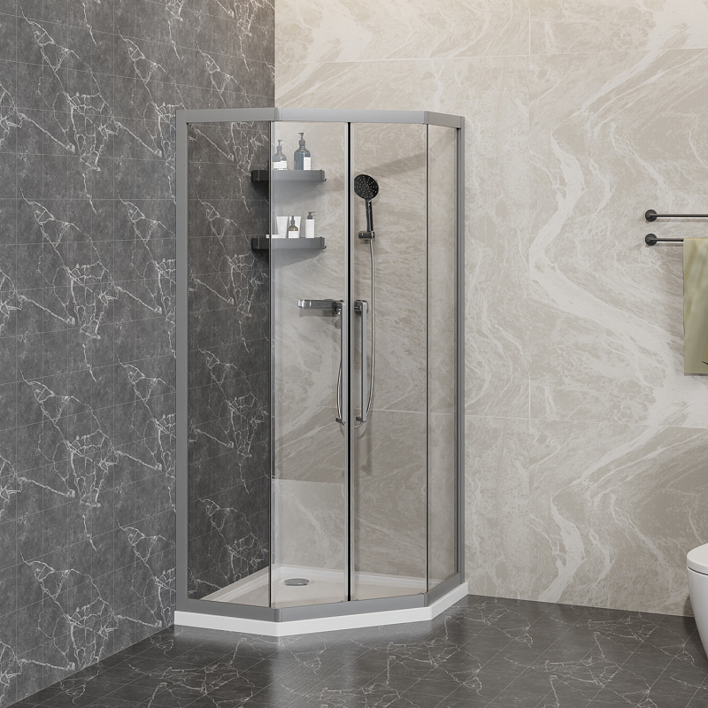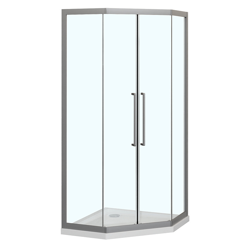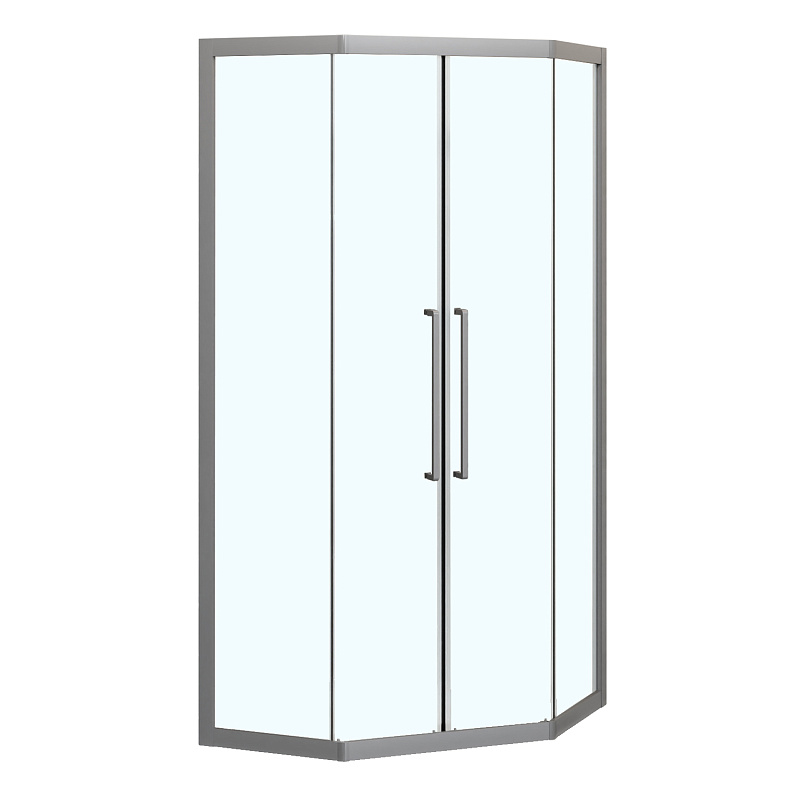 Пятиугольный душевой уголок, с двумя раздвижными дверьми, на усиленных двойных роликах с нержавеющими подшипниками.