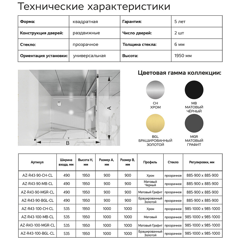 —Душевое ограждение Azario SHANGHAI 1000х1000х1950 прозрачное стекло 6 мм, профиль хром (AZ-R43-100-CH-CL)