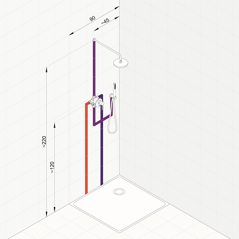 Верхний душ, Держатель для душа, Душевая лейка, Душевой шланг, Комплект креплений, Кронштейн для верхнего душа, Скрытая монтажная часть, Смеситель, Шланговое подключение