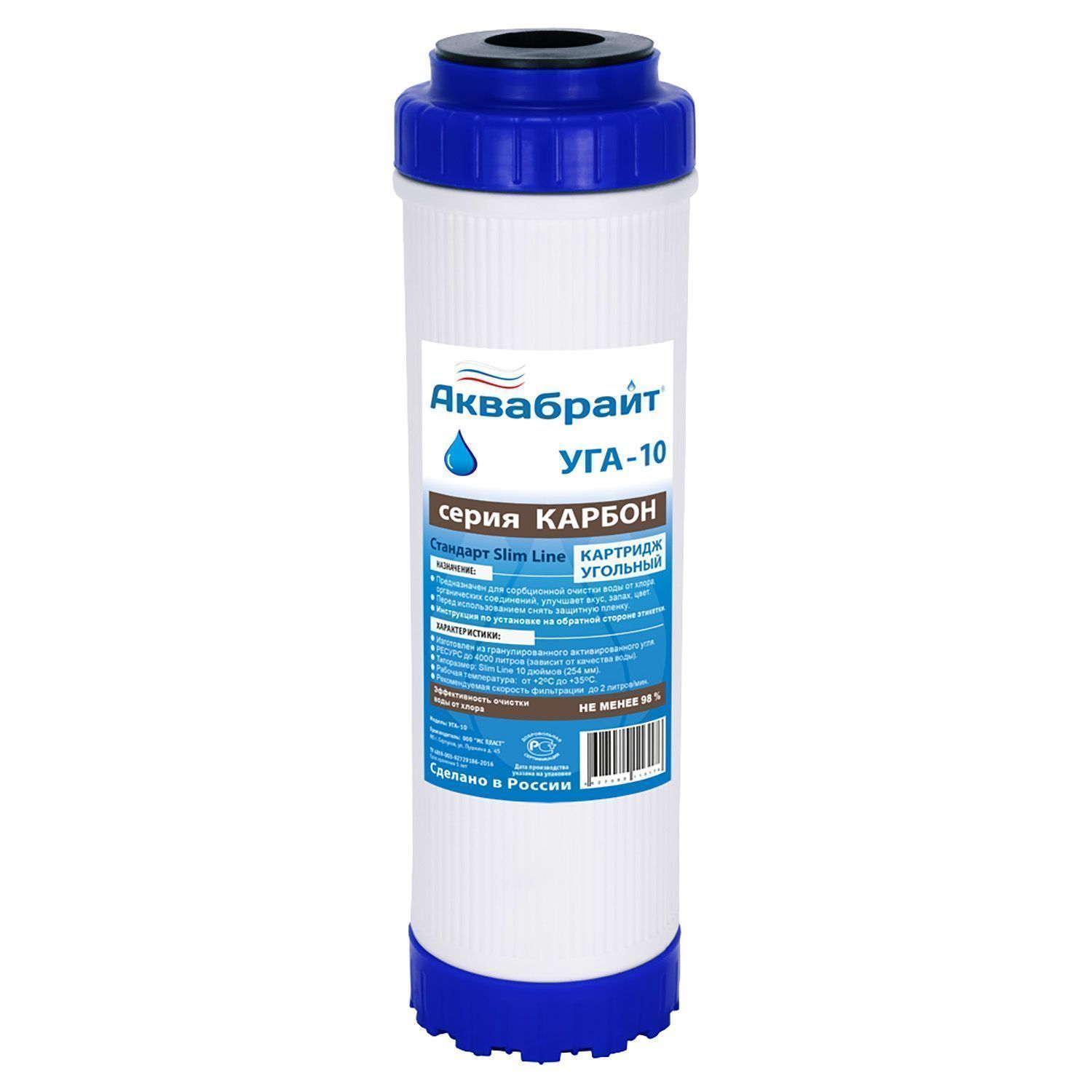 —Картридж для очистки воды АКВАБРАЙТ гранулированный, Slim Line 10", ресурс до 4000 л (УГА-10)
