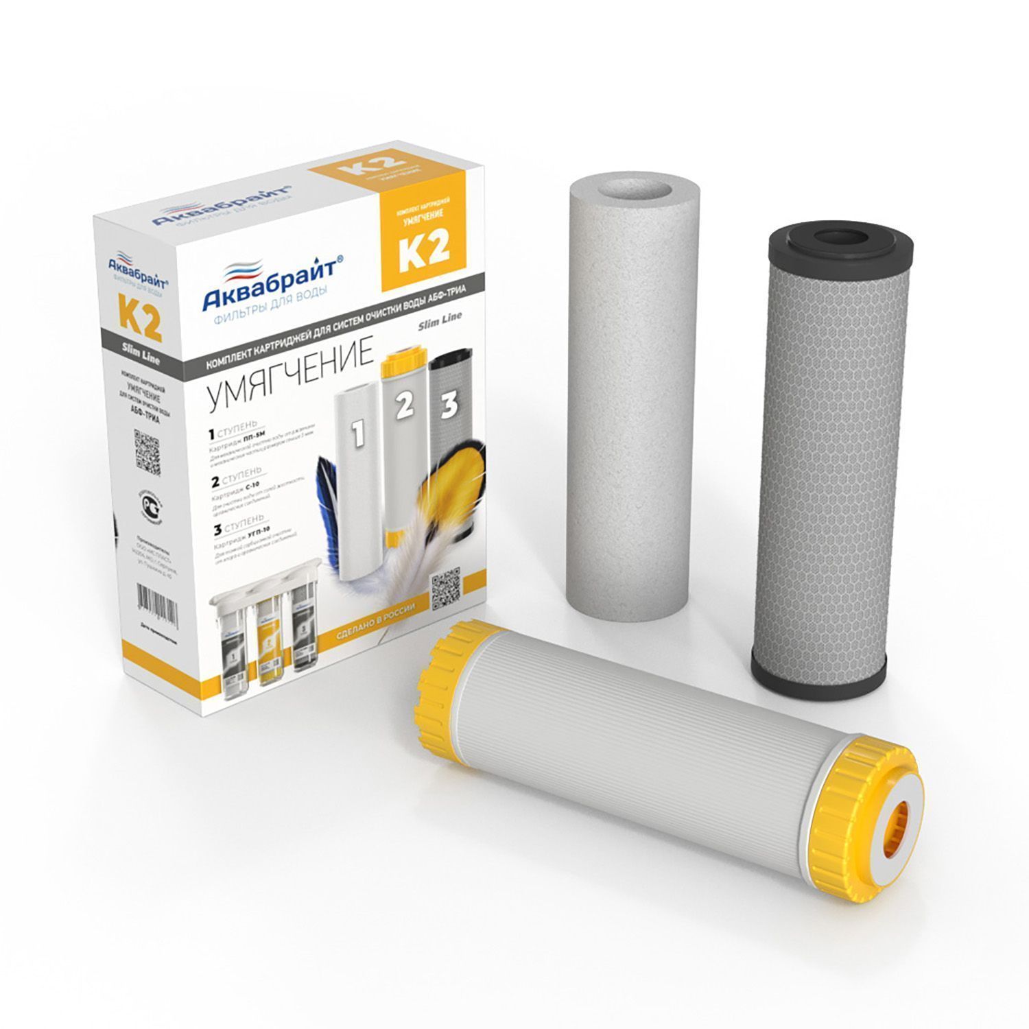 Комплект Картриджей К-2  АКВАБРАЙТ УМЯГЧЕНИЕ  для очистки воды. Предназначен для установки в питьевые системы серии АБФ-ТРИА  под кухонную мойку. В комплект входят картриджи: ПП-5М, УГП-10, С-10.