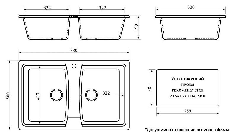 —Кухонная мойка AZARIO Элмас 780х500х190 двойная, искусственный мрамор, цвет белый (CS00078329)