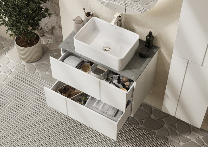 —Комплект: Тумба под раковину Roca Pilar 80 подвесная, 2 ящика + Столешница Roca Pilar 80, керамогранит, серая + раковина накладная MILA, белый (Z.RU93.1.044.8)