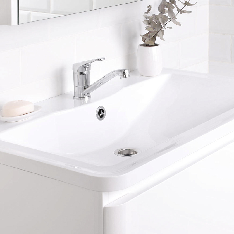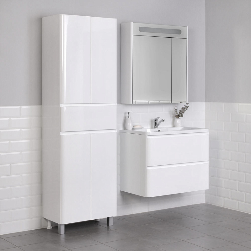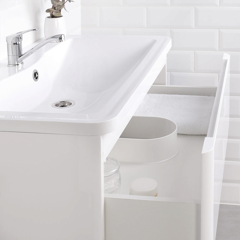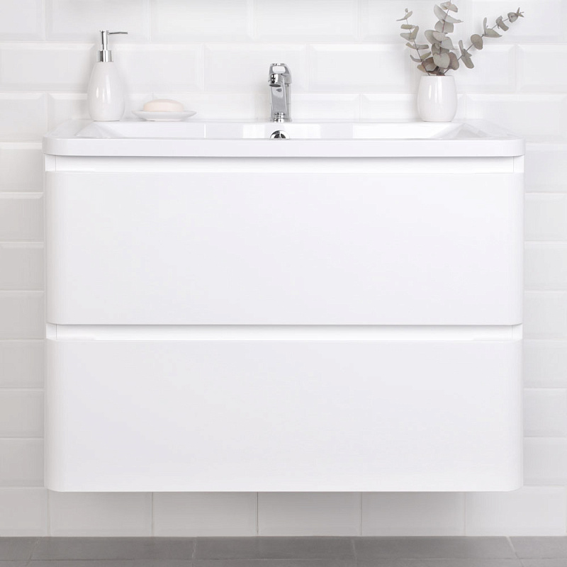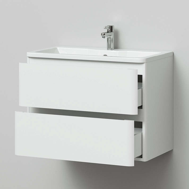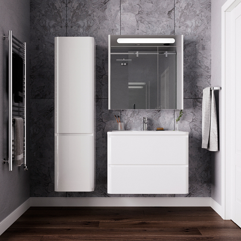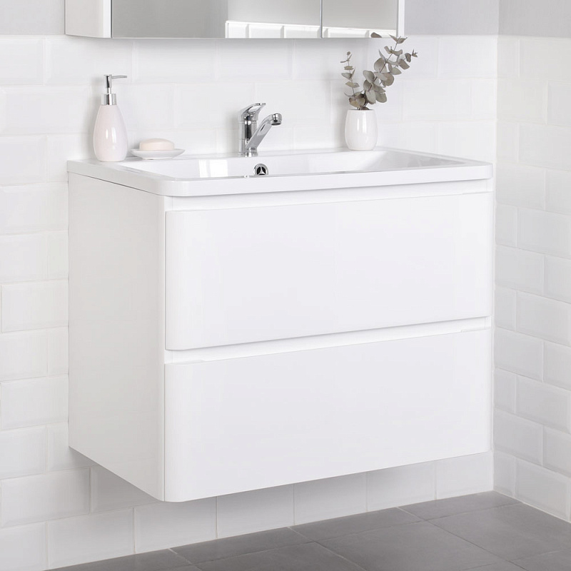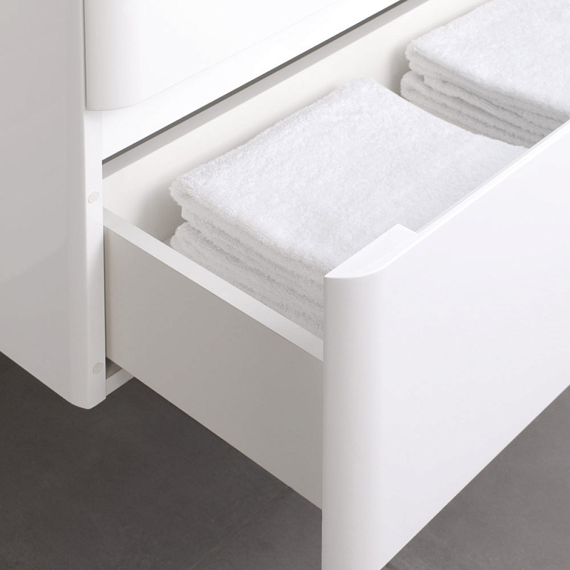 Идеальный белый глянец в сочетании с современным лаконичным дизайном-это коллекция Roberto.Эстетика изящества и минимализма-скругленные фасады,фрезерованные ручки,умывальник из литьевого мрамора,со скругленными углами.Подвесная тумба выполнена из влагозащищенного МДФ,покрытого белоснежной глянцевой эмалью.Качественная фурнитура с доводчиками.Плавное и бесшумное закрывание ящиков.Универсальный пластиковый вырез под сифон.Умывальник из литьевого мрамора полностью закрывает корпус тумбы,что обеспечивает дополнительную защиту от воды.Подвесной способ установки дает возможность не только визуально увеличить пространство, но и обеспечивает быстрый и удобный доступ для уборки.Мебель способна вместить в себя достаточно много вещей.Изысканность,простота и гармоничность-все сошлось в этой прекрасной коллекции!