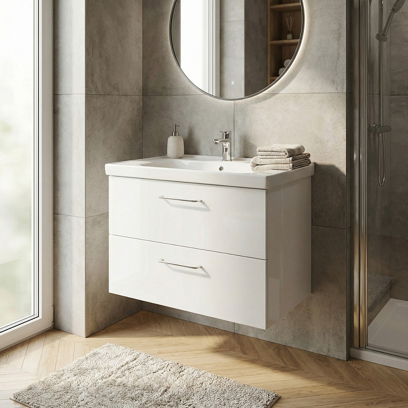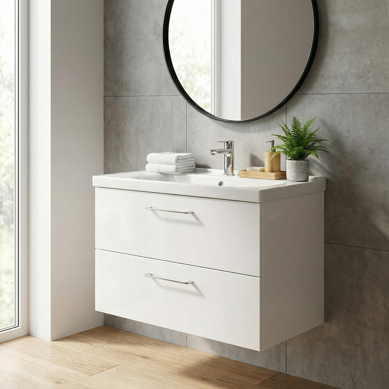 Высокое качество материалов: Использование МДФ, глянцевой эмали и санфаянса гарантирует долговечность и устойчивость к воздействию влаги и перепадам температур.
