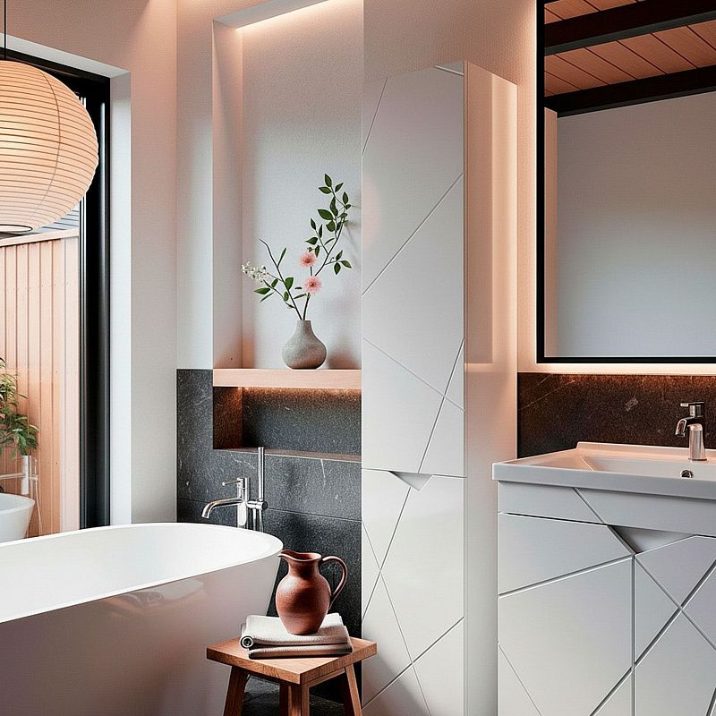 Модели одного комплекта (набора) мебели Оптимум выполнены в едином архитектурно-художественном и конструктивно-технологическом решении. Фасады имеют геометрическую фрезеровку с встроенной ручкой. Классический конструктив тумб под раковину с двумя дверцами и полкой позволяет удобно разместить бытовую химию, косметические средства и все необходимое.