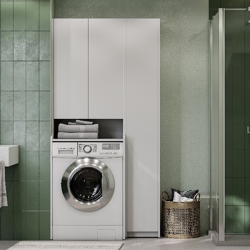 - Вместительный шкаф Лондри позволяет максимально использовать пространство над стиральной машиной для хранения чистящих и моющих средств.