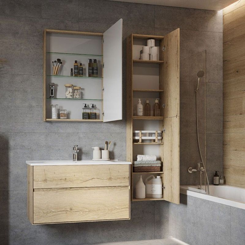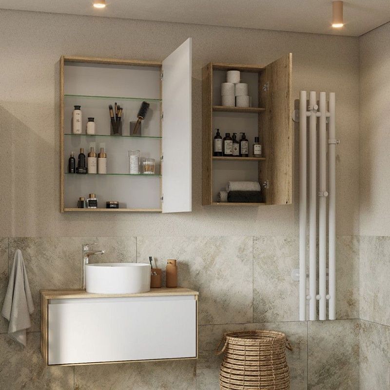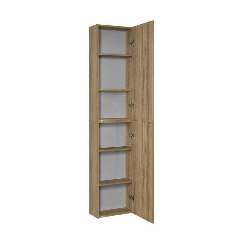 Коллекция мебели Либерти предлагает функциональные и эстетичные решения для ванных комнат. Дополнительное место для хранения можно получить благодаря навесному шкафу, выполненному той же цветовой гамме, что и другие изделия. Корпус и фасад изготовлены из влагостойкой ЛДСП под текстурированное дерево. Боковины обработаны по особой технологии, создающей эффект тонких линий и в то же время сохраняющей надежность конструкции. Навесной шкаф оснащен механизмом Push-to-Open, гарантирующим плавное открывание и закрывание. За дверцами шкафа находятся регулируемые полки из влагостойкой ДСП, что обеспечивает удобство хранения различных предметов.