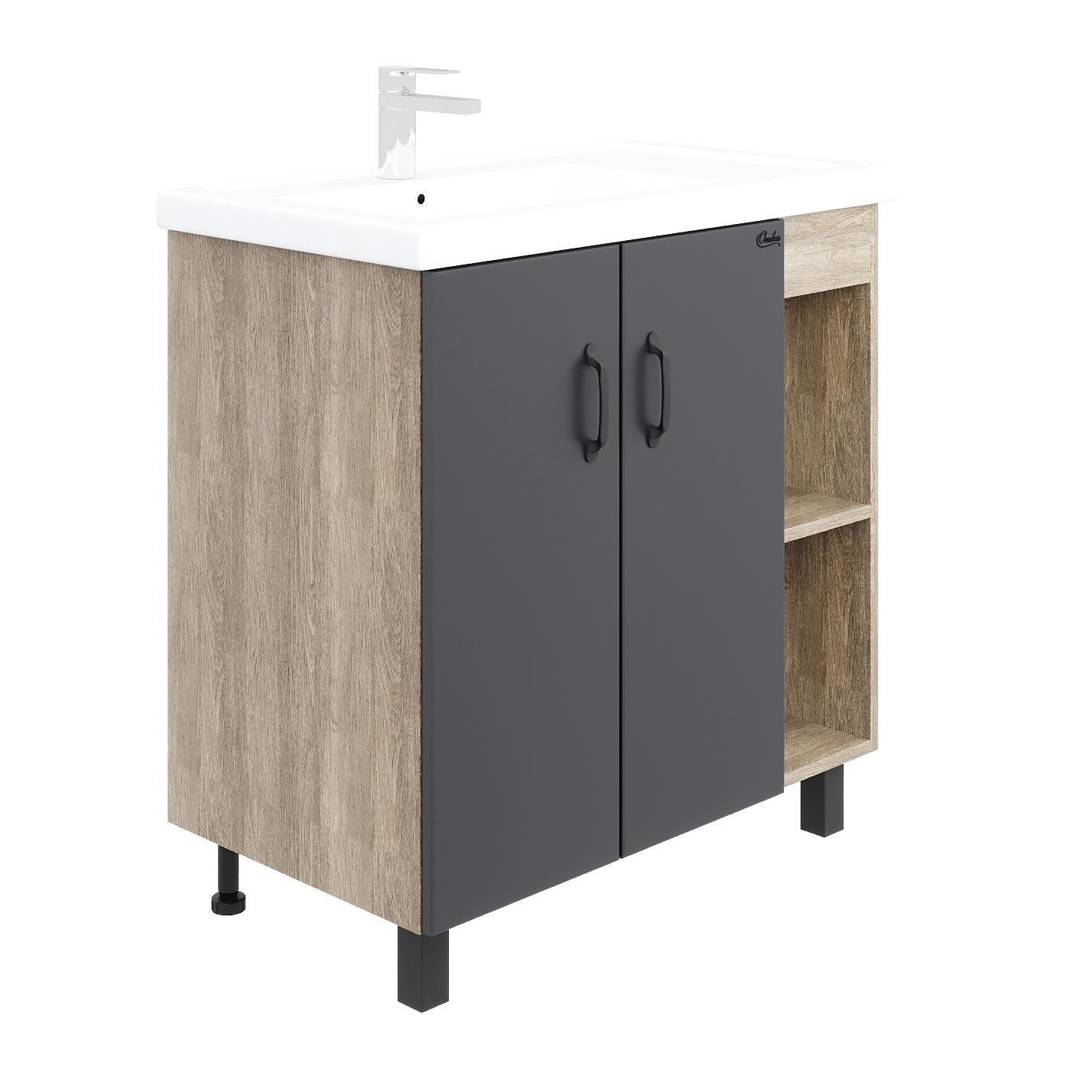 В тумбе Onika ТИМБЕР 80.01 удачно сочетаются контрастные цвета и фактуры: серый матовый фасад с покрытием SoftTouch, корпус цвета дуба с роскошной текстурой, черная матовая металлическая фурнитура.