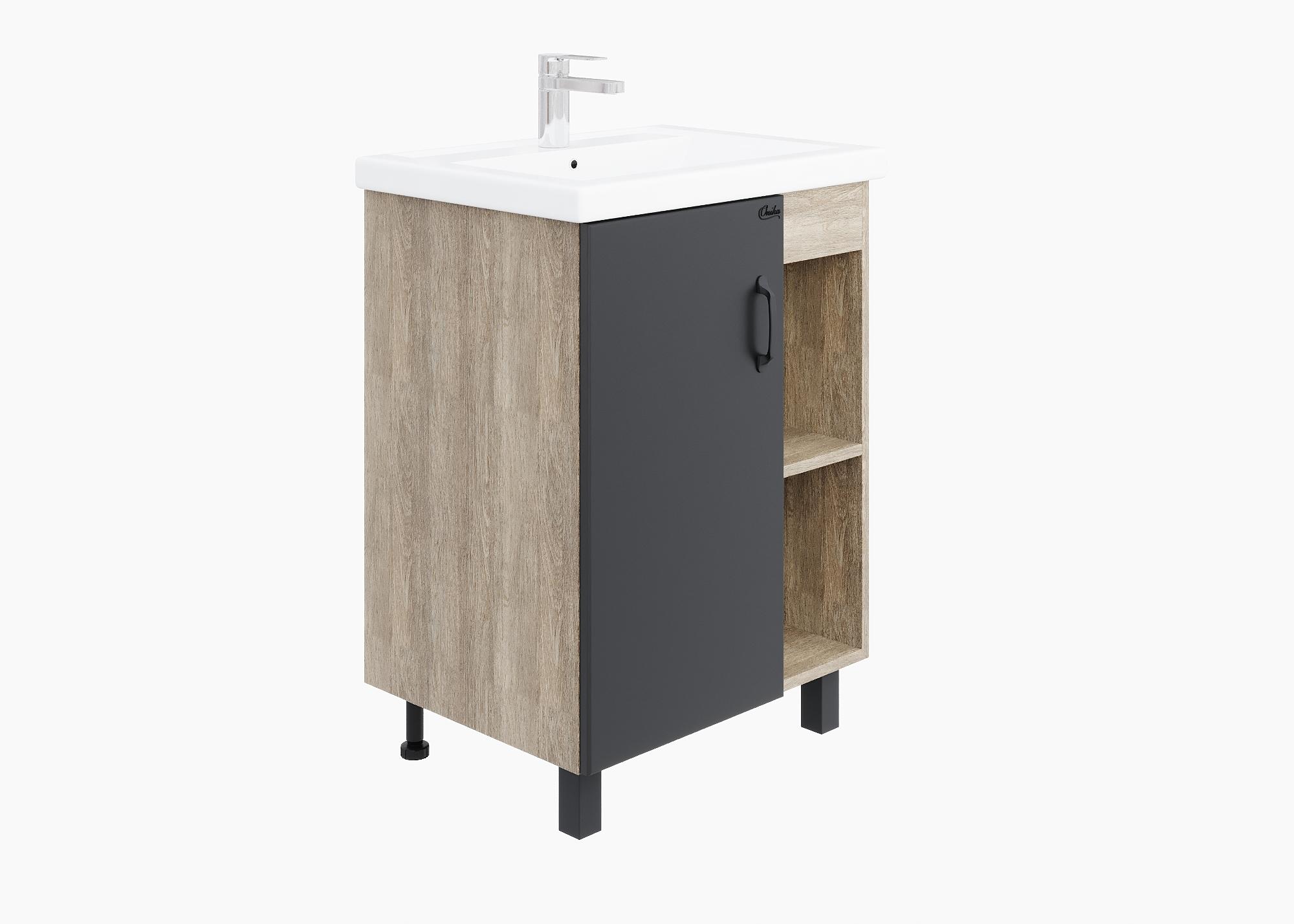 В тумбе Onika ТИМБЕР 60.01 удачно сочетаются контрастные цвета и фактуры: серый матовый фасад с покрытием SoftTouch, корпус цвета дуба с роскошной текстурой, черная матовая металлическая фурнитура.