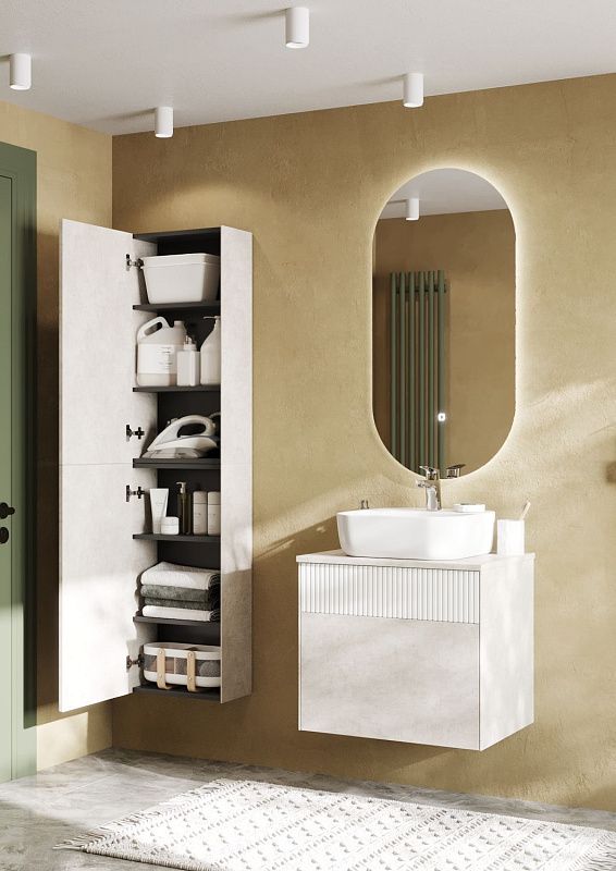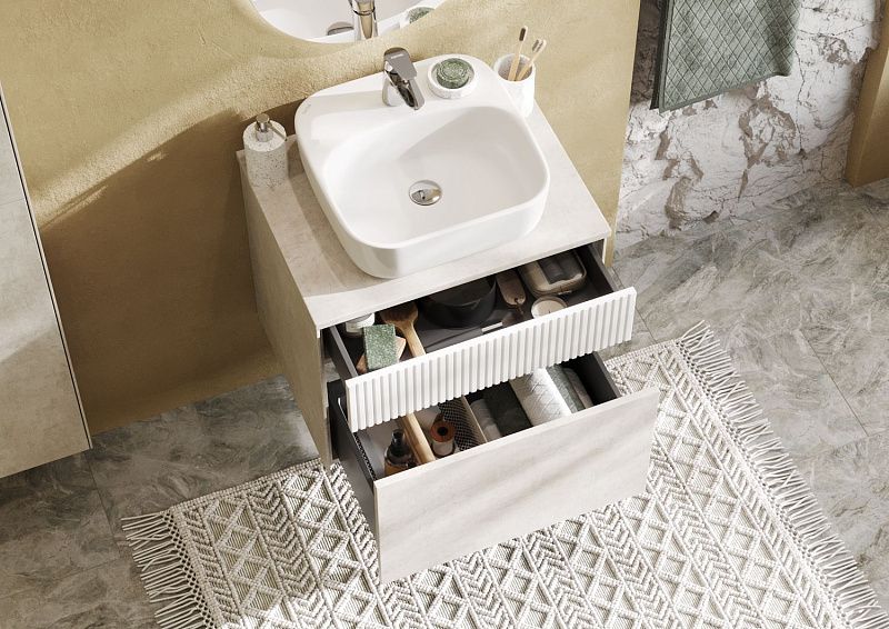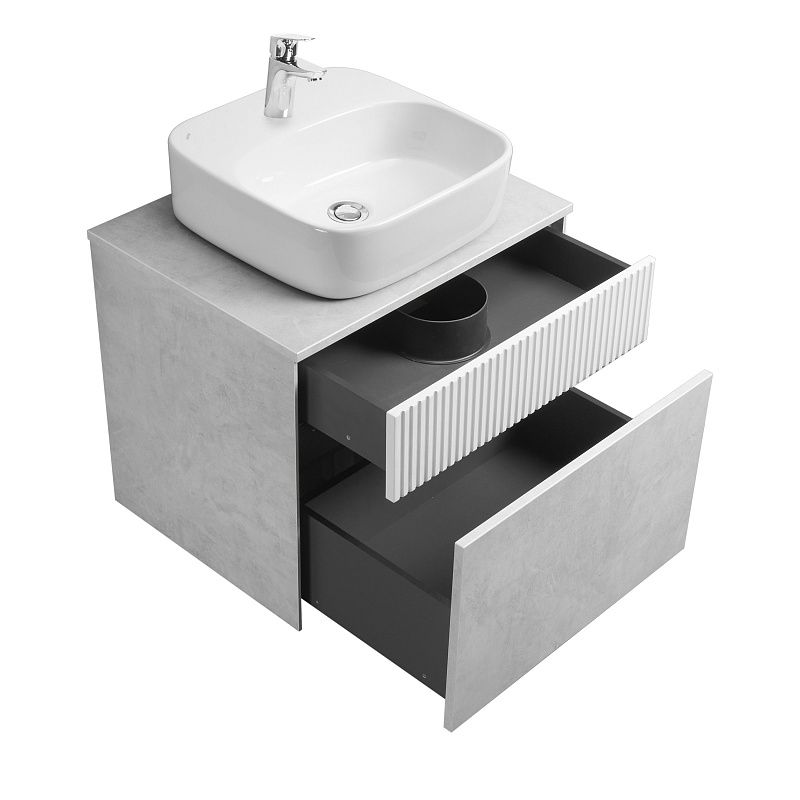 Тумба Марбл 60 функционально состоит из двух вместительных ящиков, оснащенных системой push to open, обеспечивающей надежное, комфортное и бесшумное закрывание. Верхний фасад изделия выполнен из МДФ с реечной фрезеровкой в белой матовой пленке с эффектом soft touch, а нижний фасад и корпус из ламинированной влагостойкой ДСП Слэйт. Верхний и нижний ящики позволяют содержать косметические средства в идеальном порядке. К тумбе идеально подходят несколько накладных раковин: раковина Santek Одри Soft, Roca Mila круглая и Roca Mila прямоугольная. Раковины продаются отдельно.