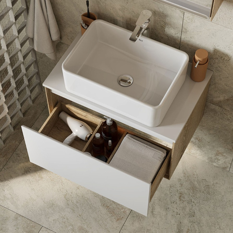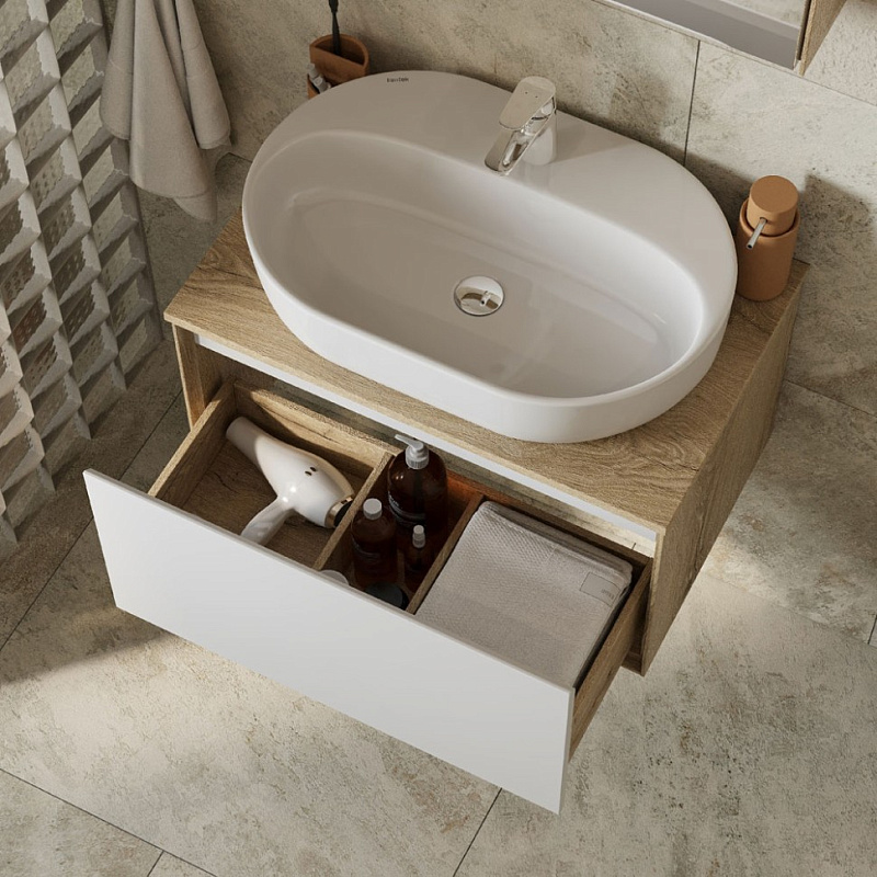 Коллекция мебели Либерти предлагает функциональные и эстетичные решения для ванных комнат. Тумбы с 1 ящиком выполнены в скандинавском стиле: сочетание теплого дерева и строгого белого глянца. Корпус и внутренняя организация тумб изготовлены из влагостойкой ЛДСП, имитирующей текстуру дерева, а фасад выполнен из влагостойкой ЛДСП в покраске белый глянец. Боковины тумб обработаны по особой технологии, создающей эффект тонких линий и в то же время сохраняющей надежность конструкции.