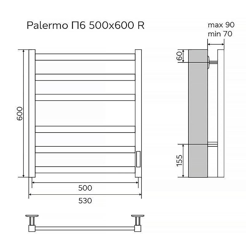 Полотенцесушитель электрический AZARIO PALERMO 500/600 квадрат, 6 секций, диммер справа, графит (AZ83901G)