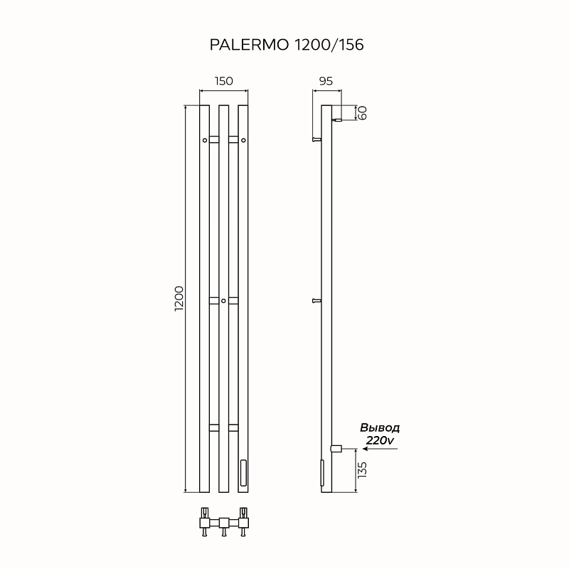 Полотенцесушитель электрический AZARIO PALERMO 1200/156 стойка, квадрат, 3 секции, диммер справа, графит (AZ83856G)