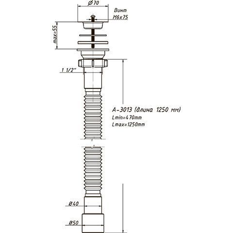Гибкая труба 1 1/2"х40/50 с выпуском с нержавеющей чашкой д.70мм для раковины и мойки. Длина гибкой трубы 470-1250мм.