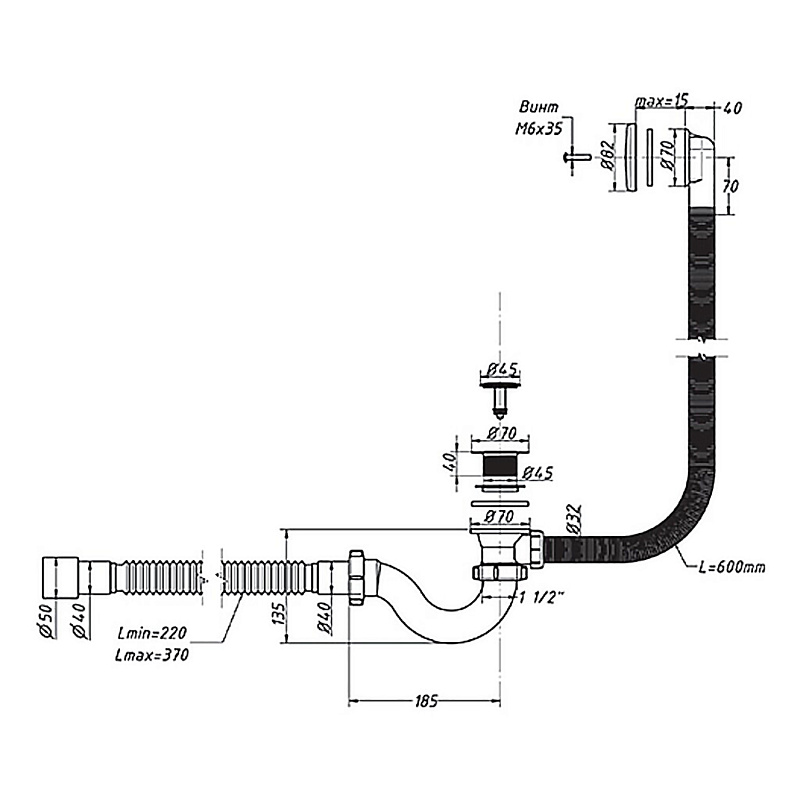 Сифон комплектуется качественным хромированным латунным клик-клаком, с грибком-пробкой ( Д. 45мм), которая перекрывает только сам слив и нержавеющей хромированной крышкой перелива. Длина трубки перелива 60см. Литая конструкция сифона самоочищающаяся и позволяет добиться максимальной скорости слива воды. Гибкий отвод позволяет подключить слив сифона к канализации с диаметрами 40 или 50мм.
