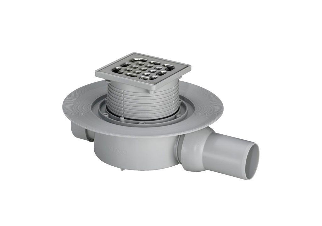 поворотная и регулируемая по высоте насадка 100x100 мм, заглушка, штампованная решетка из нержавеющей стали 1.4301, фланец для нанесения/закрепления гидроизоляции, съемное устройство для защиты от неприятного запаха из системы канализации, ввод для подключения дополнительных сантехприборов DN40, выпуск на шарнирном соединении