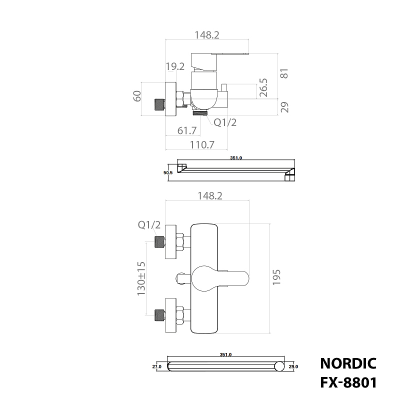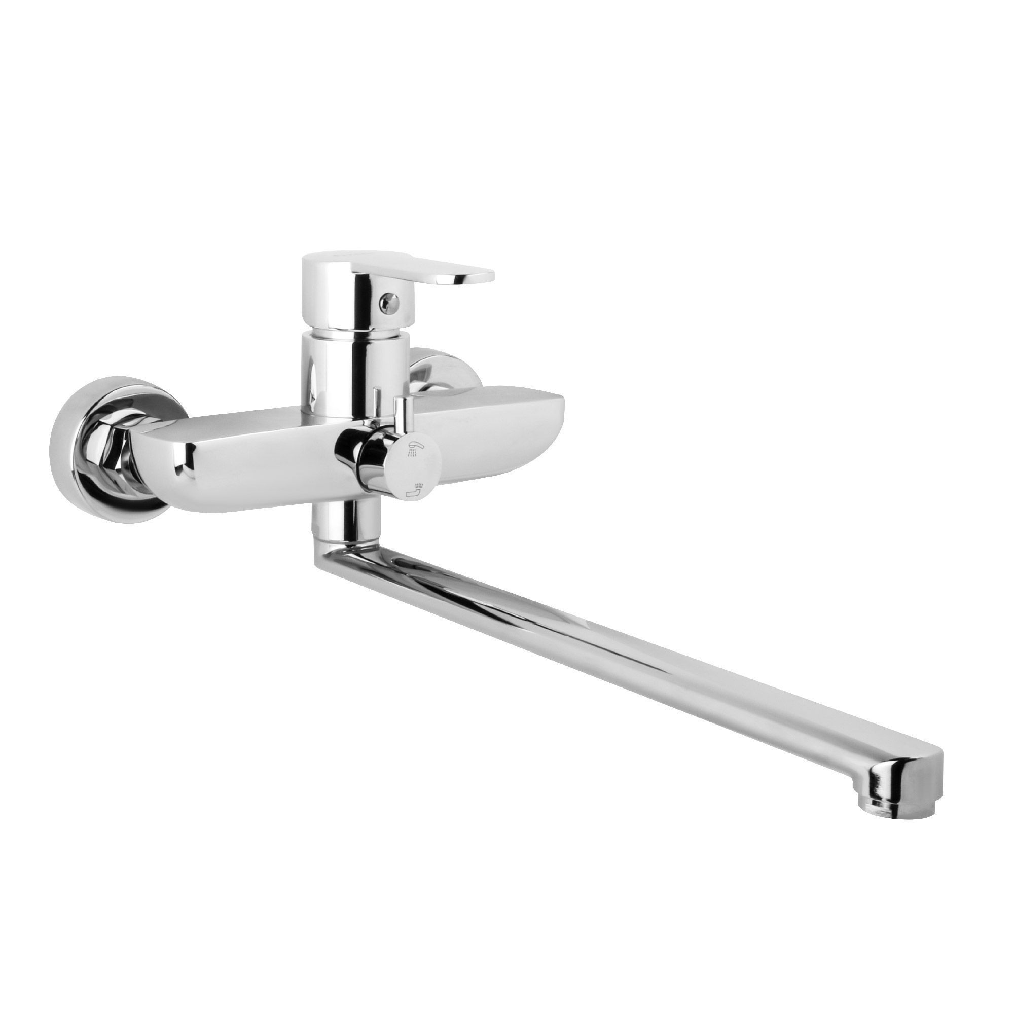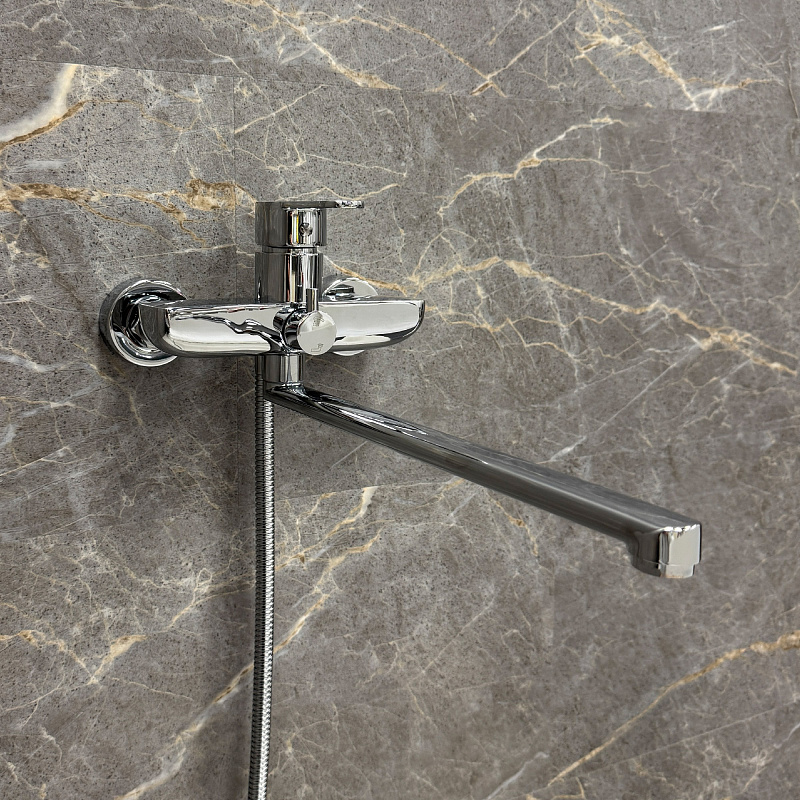 —Смеситель для ванны Fixen NORDIC однорычажный, длинный излив, керамический картридж, с душевым набором, хром (FX-8801)