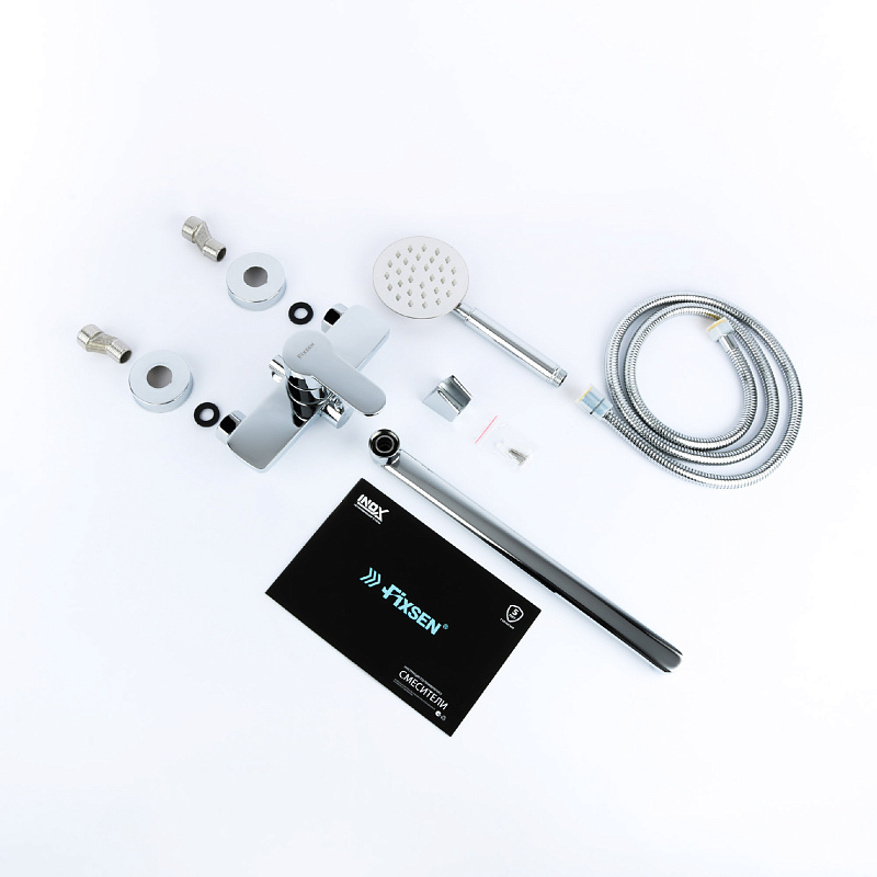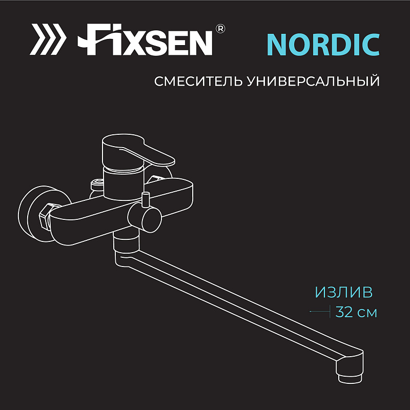 Смеситель для ванны Fixen NORDIC однорычажный, длинный излив, керамический картридж, с душевым набором, хром (FX-8801)