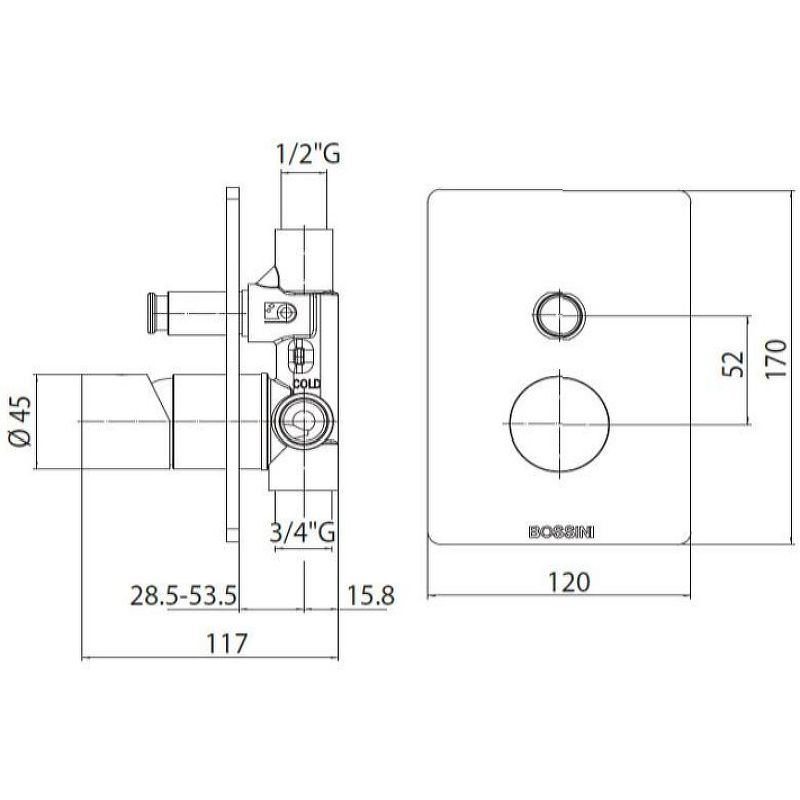 Комплект Bossini CUBE Смеситель для душа, встраиваемый, 2 выхода, внешняя часть, хром + Встраиваемая часть смесителя с девиатором 2 направления (Z00006.030+Z00005)