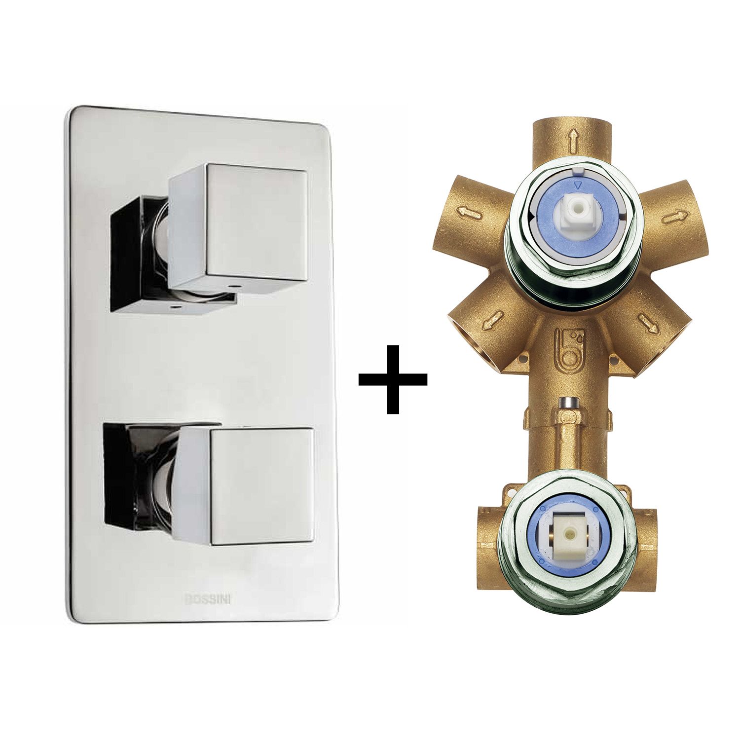Комплект Bossini CUBE Смеситель для душа, встраиваемый, внешняя часть, хром + Универсальная встроенная часть для механического смесителя на 2-5 источников (Z00062.030+Z00130)
