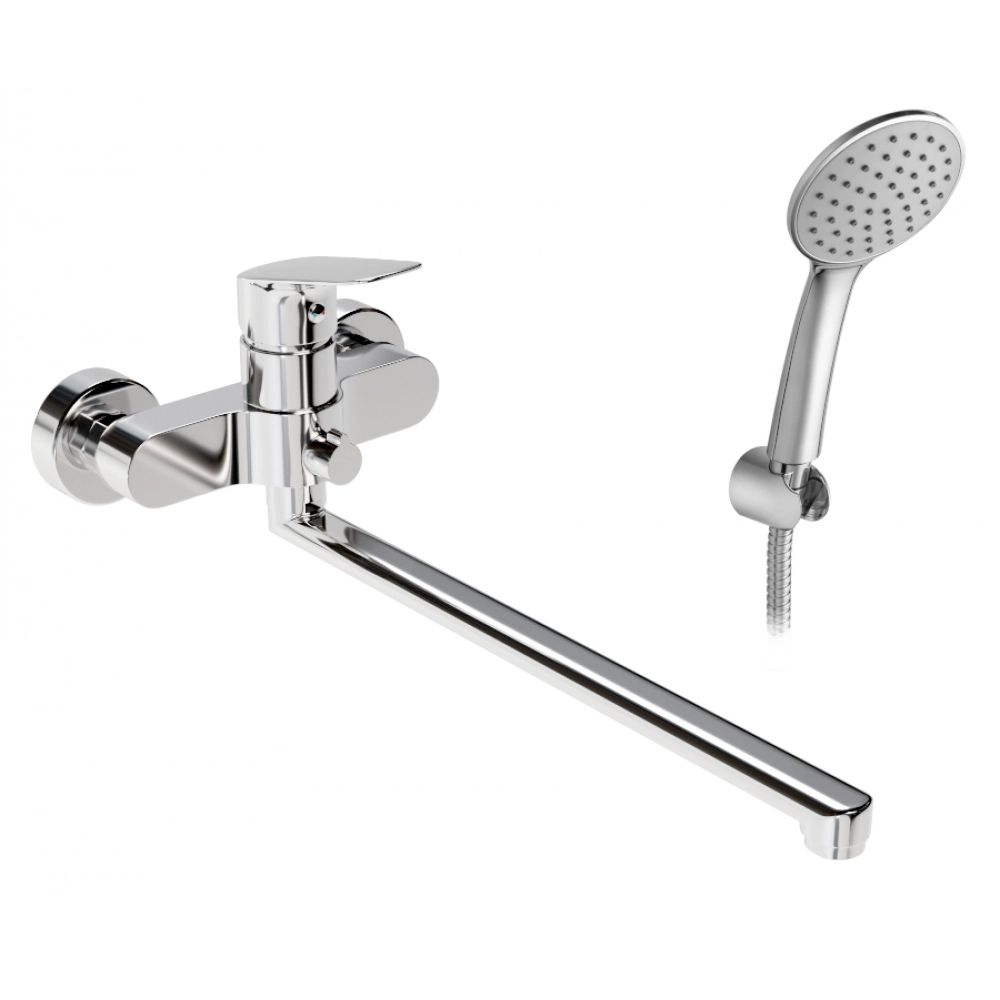 Однорычажный смеситель для ванны и душа с длинным поворотным изливом в хромированном исполнении, придает ванной комнате современный и элегантный вид.