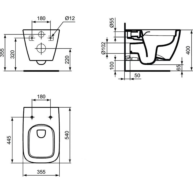 Ideal Standard i.life B Подвесной безободковый унитаз с технологией RimLS+, глубокий смыв, сидение и крышка T468201 или T468301 заказывается дополнительно, с крепежом (для полностью скрытого монтажа)