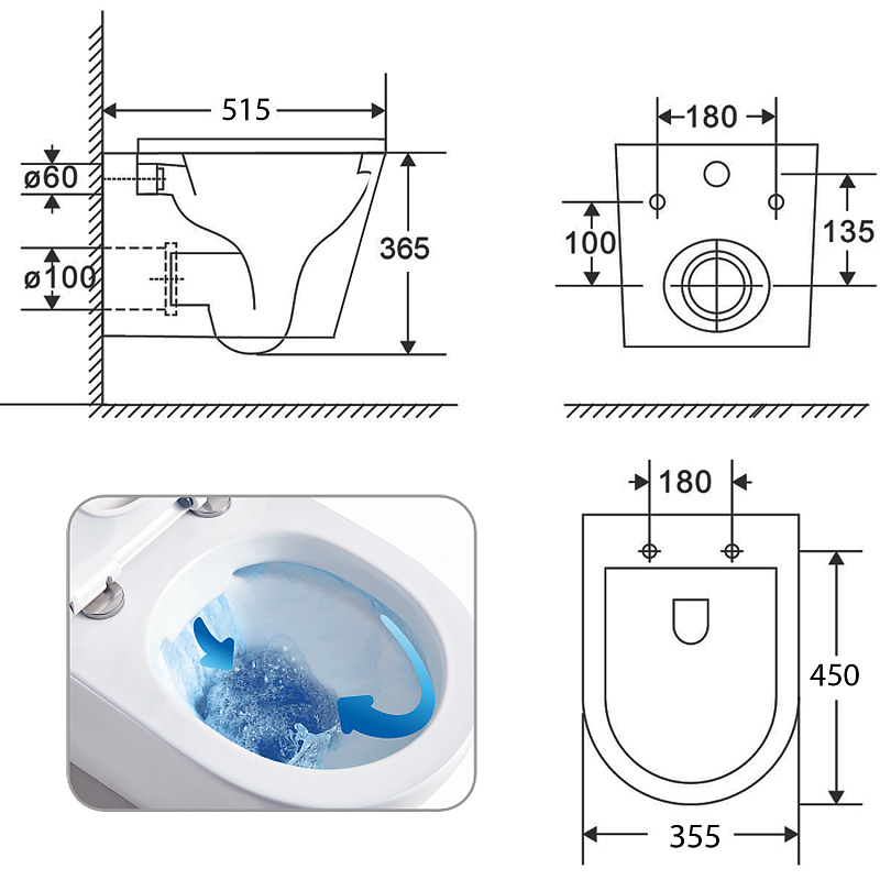 •    Габариты унитаза (515х355х365 мм) делают его идеальным выбором для ванных комнат любого размера, включая небольшие помещения. Подвесная конструкция визуально расширяет пространство, создавая ощущение легкости и простора.