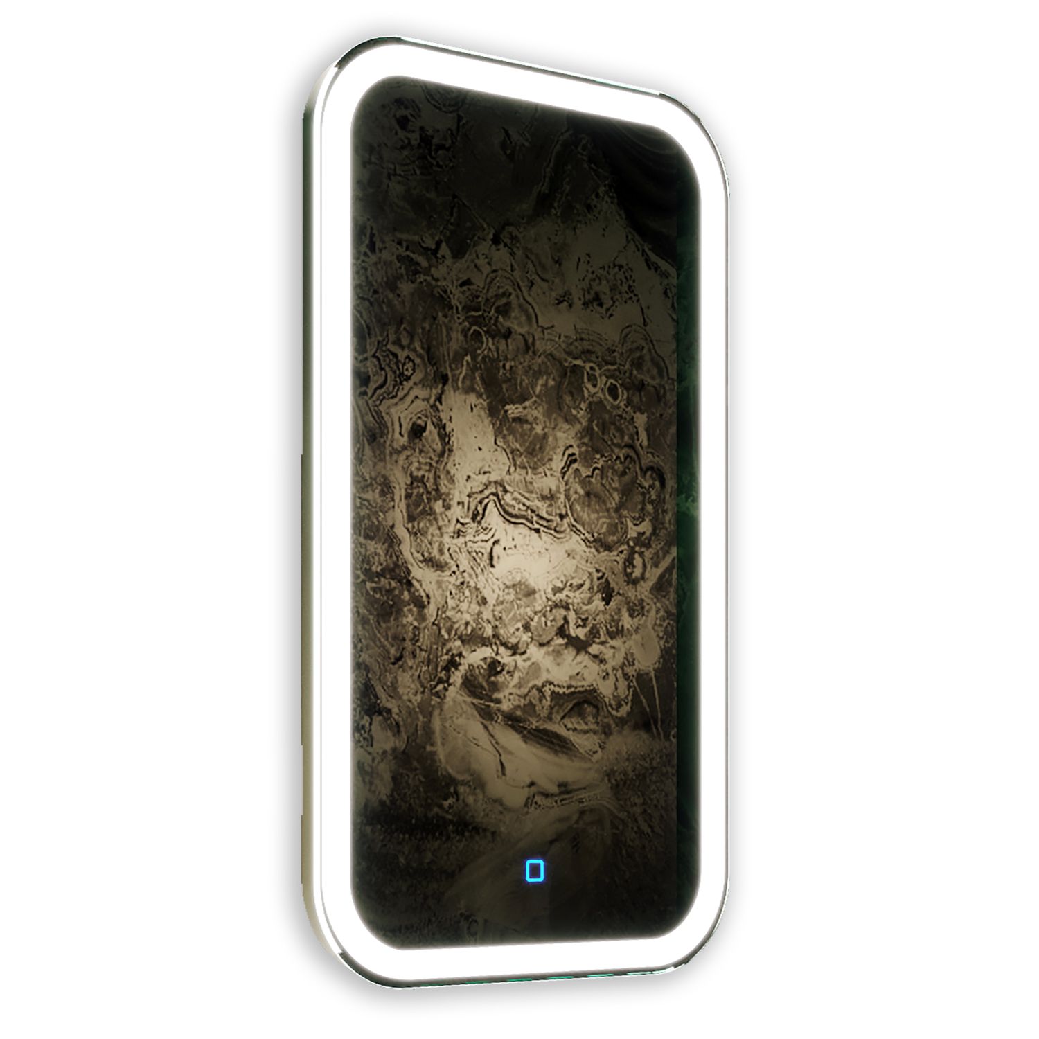 Особый характер этого зеркала с вертикальным расположением – в комбинации прямоугольной формы, мягкой геометрии и дизайна LED-подсветки. Световая рама расположена не по краям периметра, а несколько отступает от него. Графичность рисунка и всей формы смягчают скруглённые углы. Благодаря этой находке довольно минималистичный дизайн не мешает этому зеркалу быть яркой акцентной деталью любого пространства: от строгой, упорядоченной классики и сдержанного минимализма до свободолюбивых эклектичных интерьеров.
