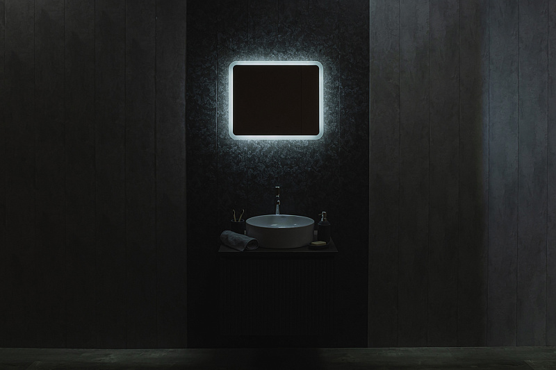 Зеркало оснащено сенсорным выключателем с функцией плавного диммирования с запоминанием последнего значения. Короткое касание светящейся области включает/выключает подсветку, длительное касание меняет яркость свечения.