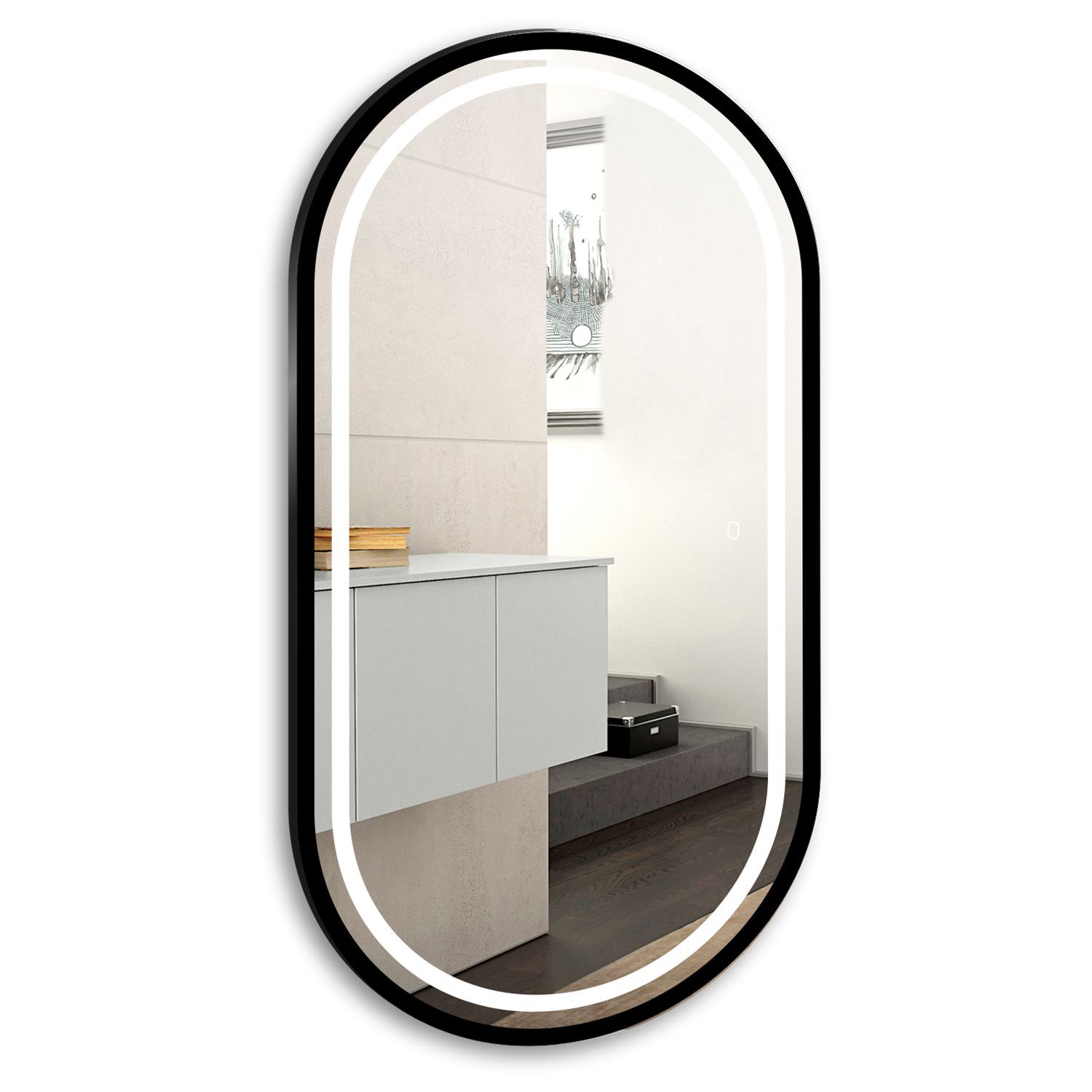 Зеркало оснащено сенсорным выключателем с функцией плавного диммирования, с запоминанием последнего значения. Короткое касание светящейся области включают/выключают подсветку, длительное касание меняет яркость свечения. Возможность горизонтального/ вертикального крепления.