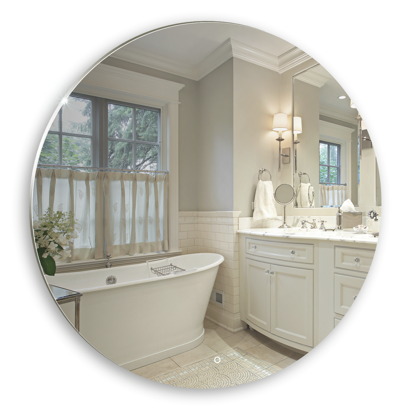 Зеркало идеальной круглой формы из стекла высшего качества M0 (влагостойкое, минимальные оптические искажения). Простая геометрия смотрится изыскано благодаря светодиодной подсветке по периметру. Мягкий свет подсветки создает эффект парения и невесомости зеркала. LED-подсветка выдерживает до 50 тыс. часов работы в непрерывном режиме. Изделие оснащено сенсорным выключателем с функцией плавного диммирования, с запоминанием последнего значения. Короткие касания светящейся области включают/выключают подсветку, длительное касание меняет яркость свечения. Прочная обрешетка упаковки защитит зеркало от повреждений. Экологически чистый продукт выполненный по стандартам ЕС.
